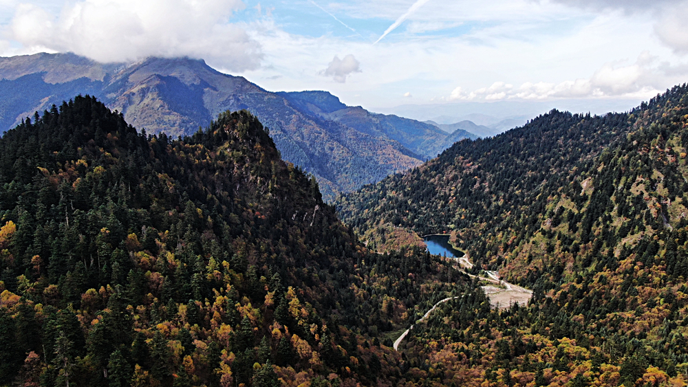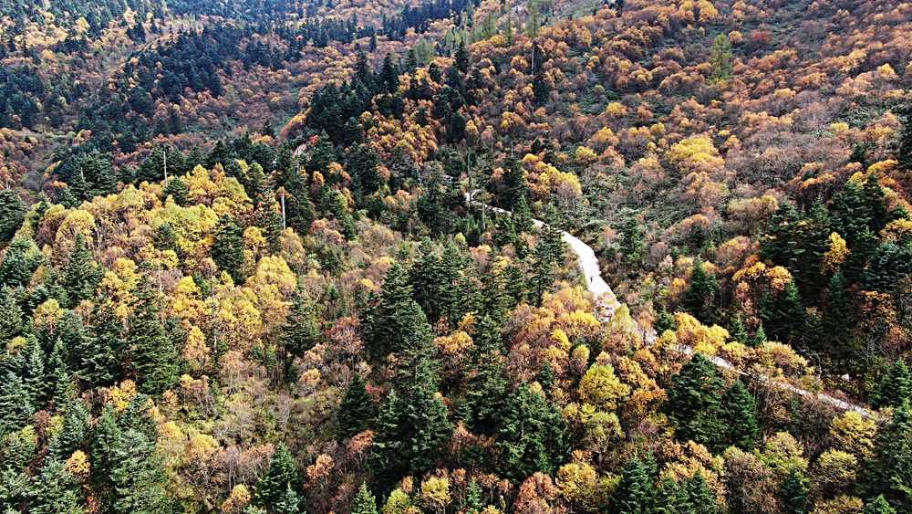 金秋時(shí)節(jié),甘肅省隴南市宕昌縣官鵝溝森林公園層林盡染,斑斕如畫,吸引了不少游客前來(lái)游玩。新華網(wǎng)發(fā)(劉輝 攝)