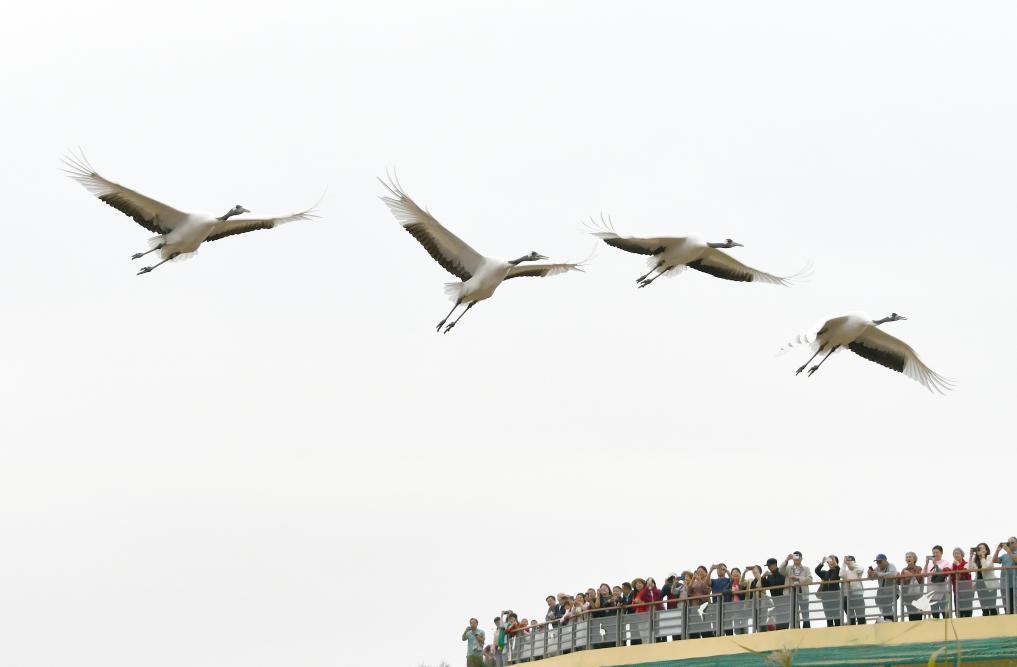 10月12日,一群丹頂鶴在東營(yíng)黃河三角洲濕地飛翔。新華社記者徐速繪 攝