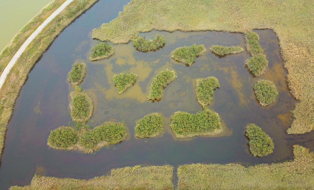 東營(yíng)黃河三角洲濕地景色(無(wú)人機(jī)照片)。新華社記者徐速繪 攝