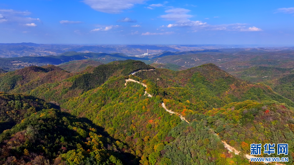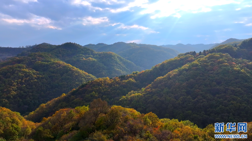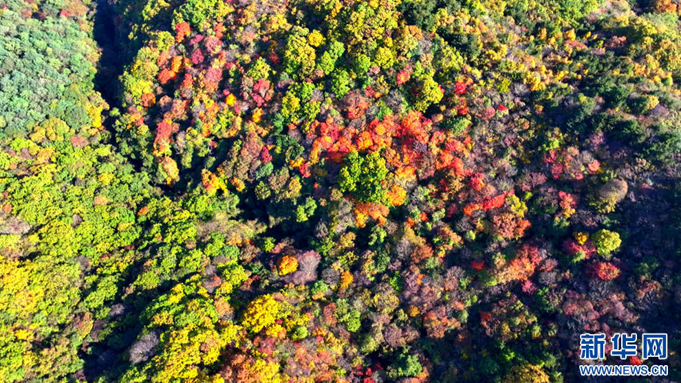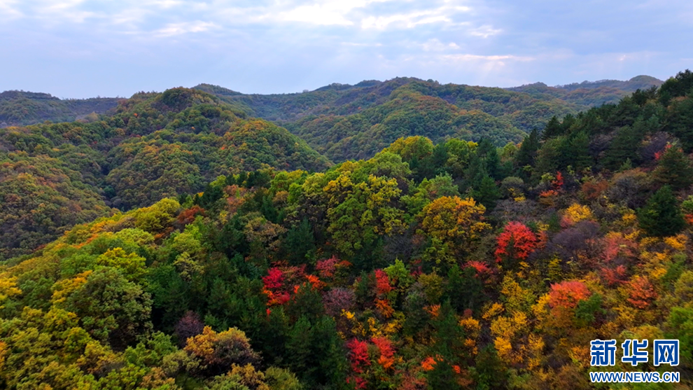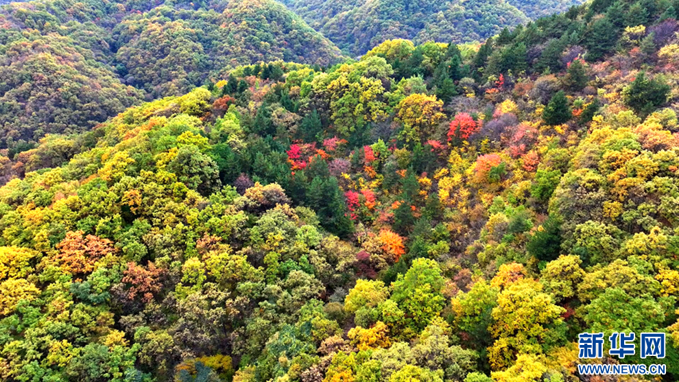 深秋時節(jié),甘肅省平?jīng)鍪谐缧趴h的唐帽山層林盡染,群山疊彩,勾勒出一幅絢麗多姿的美景圖。(圖片:高亮 文字:關(guān)改琴)