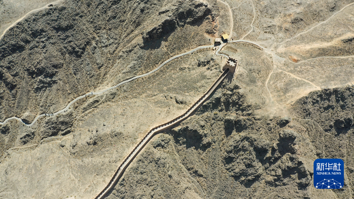 這是5月17日在甘肅省嘉峪關(guān)市拍攝的懸壁長城(無人機(jī)照片)。新華社記者 陳斌 攝