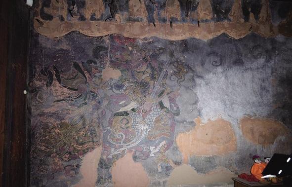 現(xiàn)建筑保存完好,塑像多被破壞,僅存明代懸塑七尊,塑像腳底踩踏祥云,衣帶飄逸靈動,面容栩栩如生。東西兩壁留有四位天神畫像。殿內(nèi)遺留的龐、劉、茍、畢四大雷部元帥門壁畫,與門楣上方的懸塑和拱眼壁上繪畫的尊神,均是研究明代道教藝術的珍貴遺存,是當?shù)厝?、道、佛三教并存,多元文化共同發(fā)展的歷史見證,對研究土司文化具有重要價值。