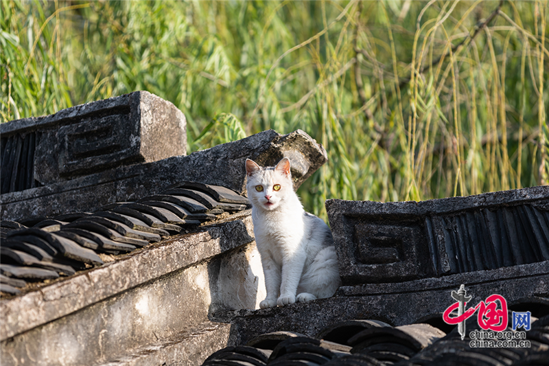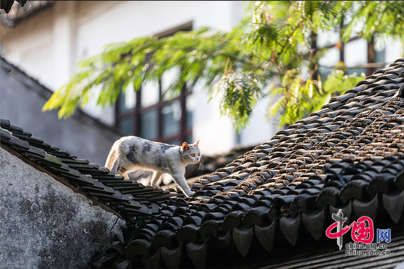 在毛孩子眼里,這就是包容一切活動的「游樂場」,片片青瓦上留下梅花印。或許你也該往古鎮(zhèn)的屋頂上瞧,檐角翹伸、清風古韻,讓人心曠神迷。或同那只貓一樣攀上高處,推窗看那水那橋,那木門青瓦,就是江南水鄉(xiāng)的具象。