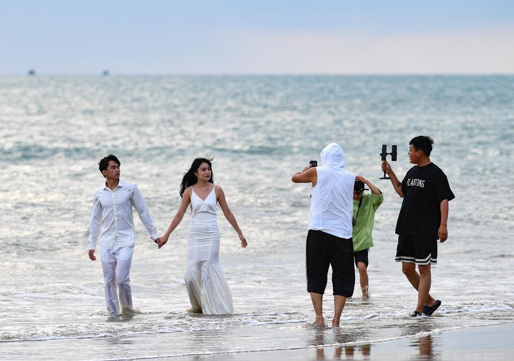 ↑2023年12月19日,一對(duì)情侶在三亞“椰夢(mèng)長(zhǎng)廊”海濱風(fēng)景大道拍照留念,新華社記者 樊雨晴 攝