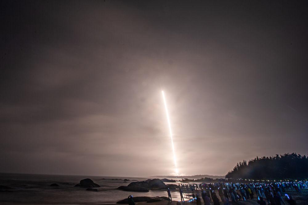 ↑長(zhǎng)征七號(hào)改遙二運(yùn)載火箭在海南文昌航天發(fā)射場(chǎng)發(fā)射,吸引眾多居民和游客在海邊觀看。新華社記者 蒲曉旭 攝