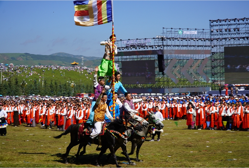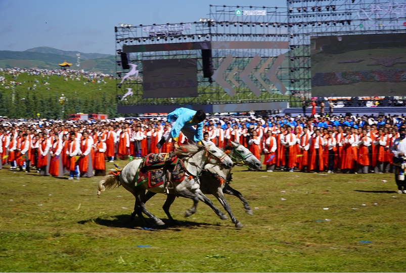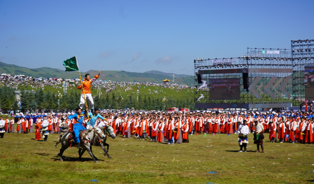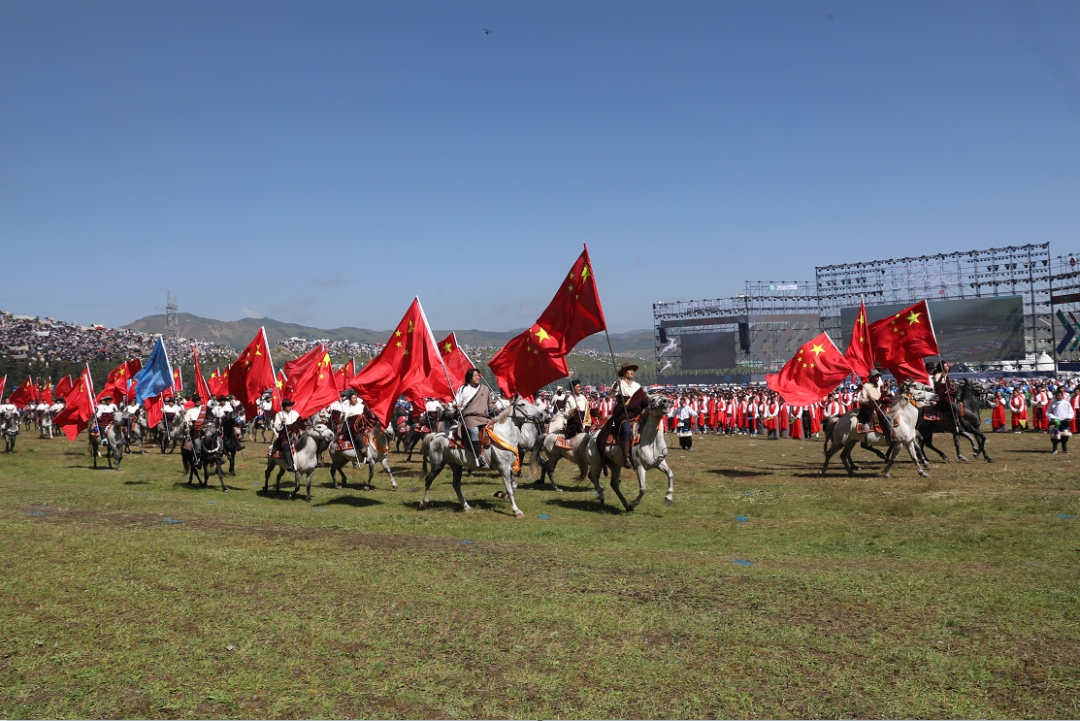 草原騎手乘著矯健的駿馬高舉著鮮艷的五星紅旗從主席臺前奔馳而過,讓在場的數(shù)萬觀眾贊嘆不已,呈現(xiàn)出一個絢麗多彩的甘南、和諧穩(wěn)定的甘南、朝氣蓬勃的甘南、包容開放的甘南、團結(jié)奮進的甘南。
