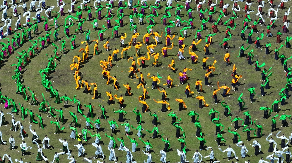 在歡快優(yōu)美的樂曲聲中,萬人鍋莊開始展演,動聽的樂曲、颯爽的舞姿、五彩的服裝,將甘南的生態(tài)之美、文化之美、民俗之美、和諧之美展示得淋漓盡致。圓圈形的鍋莊舞表達了甘南人民在中國共產(chǎn)黨領(lǐng)導下,各民族像石榴籽一樣緊緊擁抱在一起,為推動甘南高質(zhì)量發(fā)展,畫出最大同心圓。