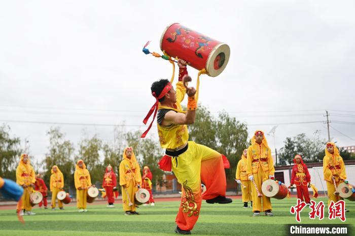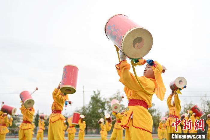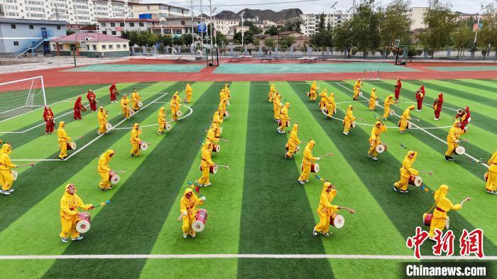 9月9日,甘肅省蘭州市皋蘭縣三川口學(xué)校學(xué)生練習(xí)蘭州太平鼓。近年來,皋蘭縣將國家級非物質(zhì)文化遺產(chǎn)蘭州太平鼓納入各中小學(xué)課后服務(wù)內(nèi)容,成立中小學(xué)太平鼓隊13支,定期邀請非遺傳承人走進校園,進行傳統(tǒng)文化授課和培訓(xùn),使學(xué)生親身感受中華優(yōu)秀傳統(tǒng)文化的魅力。蘭州太平鼓舞已有六百余年的歷史,素有“天下第一鼓”之稱,2006年被列入中國第一批非物質(zhì)文化遺產(chǎn)名錄。中新社記者 九美旦增 攝