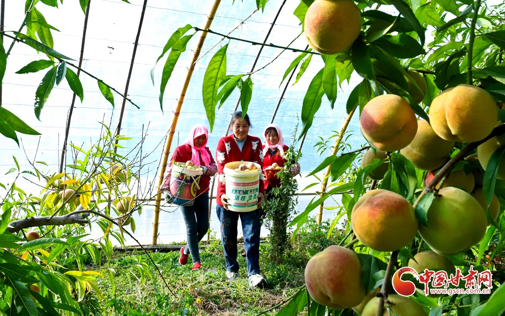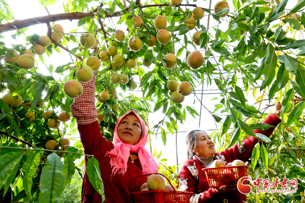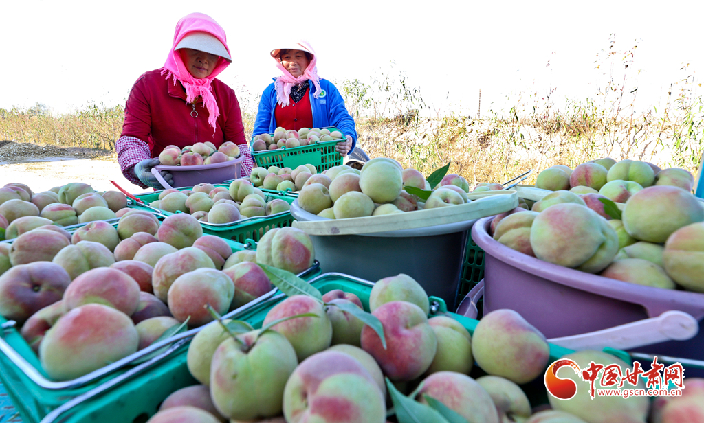 10月24日,在張掖市甘州區(qū)長安鎮(zhèn)萬通果蔬種植專業(yè)合作社“甘泉雪桃”種植基地大棚內(nèi),種植戶正在為甘肅蘭州和青海西寧的客戶采摘裝運(yùn)“甘泉雪桃”。