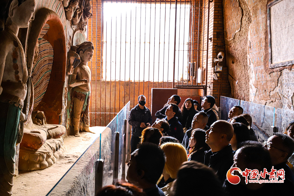 11月9日,甘肅省張掖市肅南裕固族自治縣馬蹄生態(tài)文化旅游景區(qū)金塔寺石窟內(nèi),甘肅百家旅行社的導(dǎo)游們正在仔細觀賞千年石窟。