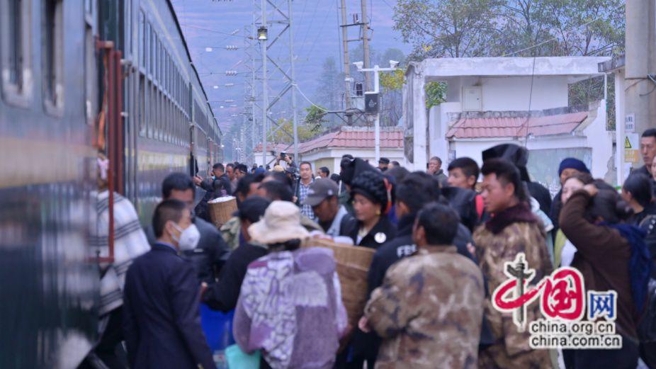 2024年11月20日,彝歷新年第一天,成昆線5633次慢火車停靠在站臺(tái),彝族同胞有序乘車。原波 攝