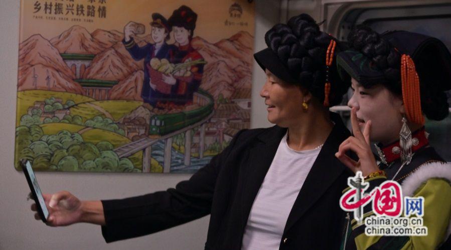 沿途,每當(dāng)列車??吭谲囌镜却臅r(shí)間,彝族老鄉(xiāng)在鐵路工作人員的協(xié)同配合下搬起水果,牽起牛羊,抱起雞鴨放進(jìn)一節(jié)節(jié)行李車廂上,慢火車的貨架上擺滿了農(nóng)產(chǎn)品。車廂里,人們互相交談,圍坐在一起放聲歌唱,好不熱鬧,歡樂(lè)的聲音從車廂內(nèi)傳出,像是在向廣袤的山川大地宣告著彝歷新年的盛事。
