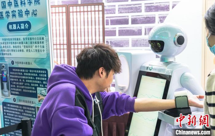 “灸童中醫(yī)藥文化周”活動上觀眾體驗(yàn)與機(jī)器人互動。中國科技館供圖