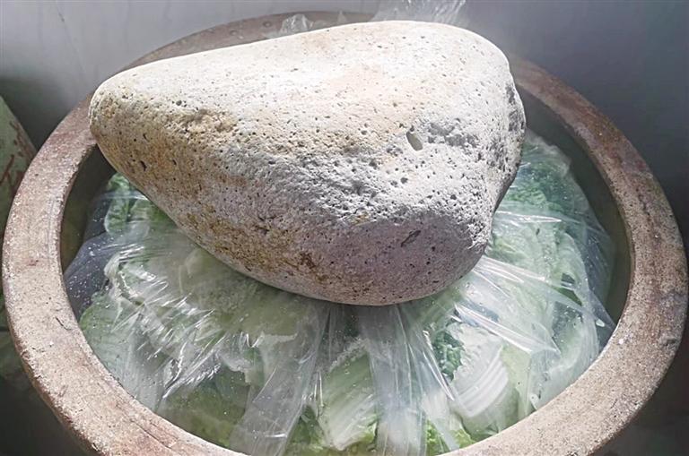 交談中,菜市場爺爺奶奶輩的老人說,除了囤好大白菜,“一口酸菜缸,一塊腌酸菜用的大石頭”也必不可少。“前一年缸里的菜吃完后,要把空缸倒扣在地面上,接上地氣,除去缸中的異味,然后洗干凈,晾干,來年再用。”老人家說,傳統(tǒng)的近半人高的醬色大缸一般都是家里的老人留下來的,那時(shí)候大家的生活條件不好,一家人的美食,都被腌制在壇壇罐罐里,甚至搬家都舍不得丟棄這口缸。腌菜用的壓菜石也是有講究的,先要夠分量,太小了壓不實(shí),太大了不方便取菜,也有人常常用幾塊卵石同時(shí)壓菜的辦法來解決;最好還要表面光滑、不扎手、好清洗,“基本都是黃河邊撿的石頭拿回去洗干凈用”。