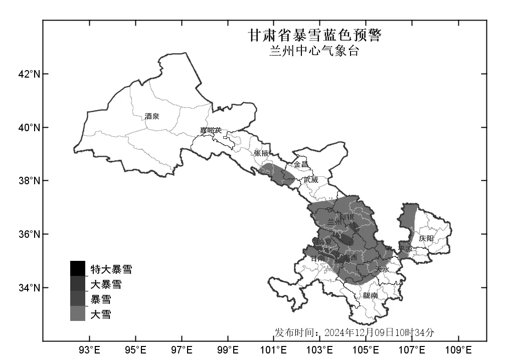 中國(guó)甘肅網(wǎng)12月9日訊(西北角·中國(guó)甘肅網(wǎng)記者 沈文剛)12月9日10時(shí)34分,蘭州中心氣象臺(tái)發(fā)布暴雪藍(lán)色預(yù)警,預(yù)計(jì)9日15時(shí)至10日20時(shí),蘭州、白銀、定西、臨夏等市州及甘南北部、天水西部、平?jīng)鑫鞑?、慶陽(yáng)西部、張掖南部、武威南部將出現(xiàn)大雪;臨夏南部、定西西部、蘭州南部、白銀中部將出現(xiàn)暴雪。