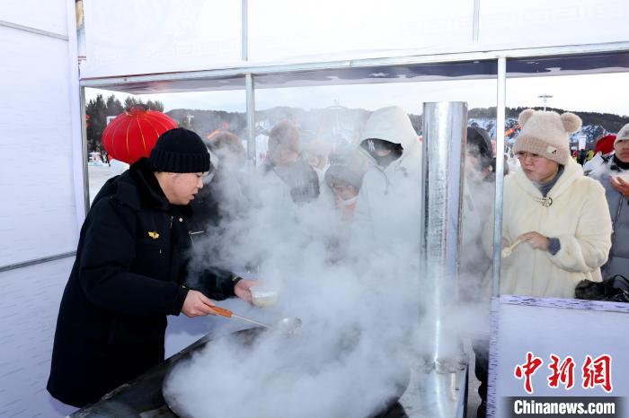 除了豐富的冰雪游樂項目,北極村七星廣場還設有非遺民俗文化展區(qū)和東北特色美食區(qū),讓游客們在參與冰雪活動的同時,還能欣賞樺樹皮畫、手工編織等具有地方特色的非物質文化作品,品嘗江水燉江魚、鐵鍋燉大鵝等東北特色美食。