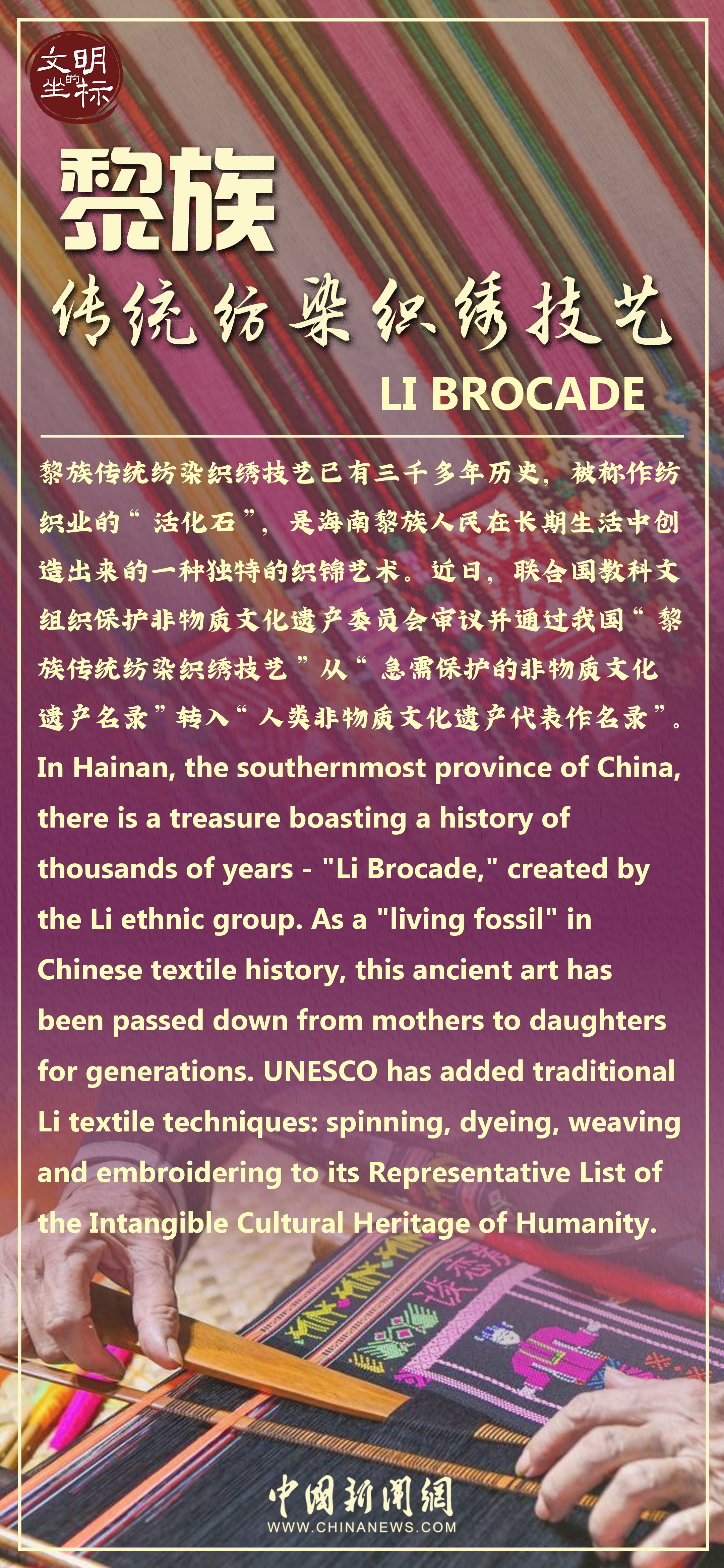 日前,黎族傳統(tǒng)紡染織繡技藝從聯(lián)合國教科文組織“急需保護(hù)的非物質(zhì)文化遺產(chǎn)名錄”轉(zhuǎn)入“人類非物質(zhì)文化遺產(chǎn)代表作名錄”,引發(fā)關(guān)注。黎族傳統(tǒng)紡染織繡技藝已有三千多年歷史,被稱作紡織業(yè)的“活化石”。對于沒有創(chuàng)造文字的黎族,黎錦像是一本“史書”,寫就了這個民族的文化和智慧。早在新石器時代,海南島上的黎族先民已會使用工具制作繩索或絲線。西漢時期,已織造出精美的“廣幅布”。至宋代,黎族的紡織達(dá)到很高水平。元代,黎族紡織工藝已傳至全國。黎族傳統(tǒng)紡染織繡技藝有麻織、棉織、織錦、印染(包括扎染)、刺繡、龍被等品種,以色彩鮮艷、圖案多樣、工藝精湛而聞名。如今,古老黎錦正穿越歷史長河,以時尚化、潮流化、年輕化的設(shè)計形態(tài)融入現(xiàn)代日常生活。