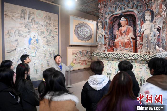 1月14日,甘肅省酒泉市,甘肅酒泉職業(yè)技術(shù)學(xué)院非物質(zhì)文化遺產(chǎn)敦煌彩塑技藝傳習(xí)所內(nèi),該校甘肅省級(jí)敦煌壁畫(huà)技藝傳承創(chuàng)新工作室負(fù)責(zé)人王權(quán)朝向?qū)W生們講述敦煌文化。中新社記者 李亞龍 攝
