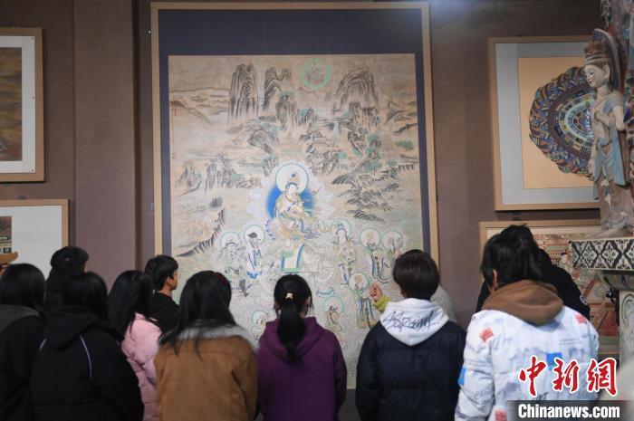 1月14日,甘肅省酒泉市,甘肅酒泉職業(yè)技術(shù)學(xué)院非物質(zhì)文化遺產(chǎn)敦煌彩塑技藝傳習(xí)所內(nèi),學(xué)生們參觀敦煌壁畫(huà)作品。中新社記者 李亞龍 攝