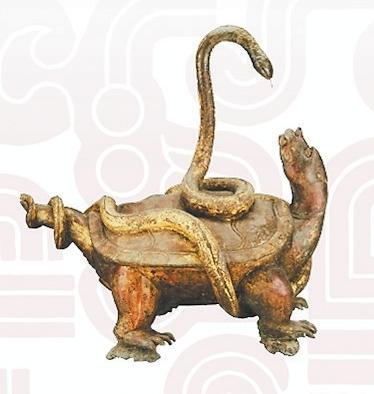 玄武是“四神”中的北方之神。《大戴禮》:“龜上彎象天,下平法地。千載神龜,問無不知,廣育無雄,以蛇為雄。故龜與蛇合謂玄武”。因此龜蛇形象的組合亦有陰陽交接之意。除了瓦當(dāng)、畫像磚、雕塑外,古人還常將此二物繪于旗上,用于指揮軍隊(duì)、消災(zāi)避害之用。