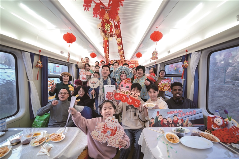 今年春節(jié),蘭州客運(yùn)段在k132次列車上舉辦了“非遺走進(jìn)春運(yùn)車廂,文化點(diǎn)亮跨年旅途”列車春晚活動(dòng)。列車上邀請(qǐng)了具有甘肅特色的太平鼓、剪紙技藝、天水刺繡的非物質(zhì)文化遺產(chǎn)代表性傳承人在列車上為大家進(jìn)行展示,并和旅客互動(dòng),還有秦腔傳承人為大家?guī)?lái)酣暢淋漓的表演,民族風(fēng)采的舞蹈《騰騰蛟起鳳》、網(wǎng)絡(luò)熱舞《APT》、自編自唱說(shuō)唱版《映山紅》,以及2024年在蘭州非?;鸬?ldquo;黃河大合唱”。最后,工作人員和旅客一起包餃子、吃餃子、送祝福,為列車文化活動(dòng)畫上圓滿的句號(hào)。
