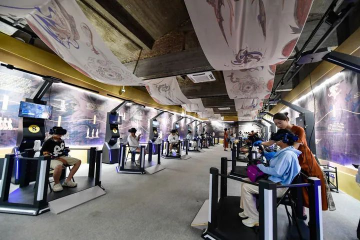 2024年7月22日,游客在敦煌體驗“尋境敦煌——數(shù)字敦煌沉浸展”。新華社記者 郎兵兵 攝