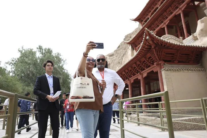 2024年6月7日,前來甘肅調研考察的駐華外交官在敦煌莫高窟九層樓前留影。新華社記者 陳斌 攝