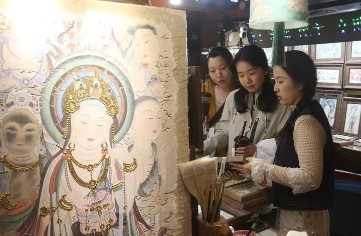 街道上,獨具特色的文化元素無處不在。民宿老板用改良的“三兔共耳”紋樣裝飾門楣,茶館的八棱柱竟是莫高窟中心塔柱的微縮版。最多的還是書店和文創(chuàng)店,一家挨著一家,紅柳根雕、敦煌樂器、創(chuàng)意工美、飛天泥版畫琳瑯滿目。
