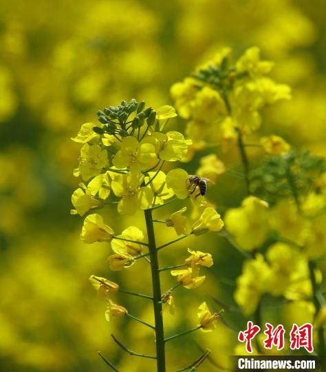 近日,云南省騰沖市界頭鎮(zhèn)成片的油菜花盛開(kāi),吸引不少游客前來(lái)觀光。金黃的油菜花海與遠(yuǎn)處白墻黛瓦的村落相映成趣,共同繪就一幅寫(xiě)意的水墨畫(huà)。圖為油菜花吸引蜜蜂采蜜。趙輝 攝