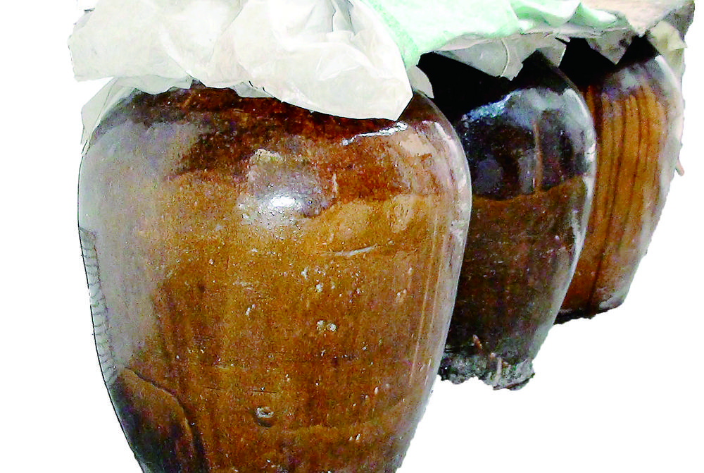 春季是釀造黃酒的最好季節(jié),也是王建平最忙碌的時(shí)候。他和徒弟們精選上等黃米、大米、小麥、大麥和青稞,清水淘洗,蒸、煮、涼、拌后,加上優(yōu)質(zhì)酒曲放入大缸密封,經(jīng)過(guò)一兩年或兩三年,甚至七八年的窖藏,榨出的地道河州黃酒質(zhì)純、色清,酒精濃度為18度左右。而封存釀期愈長(zhǎng),香味愈濃,色澤愈黃。