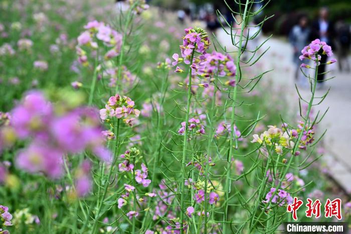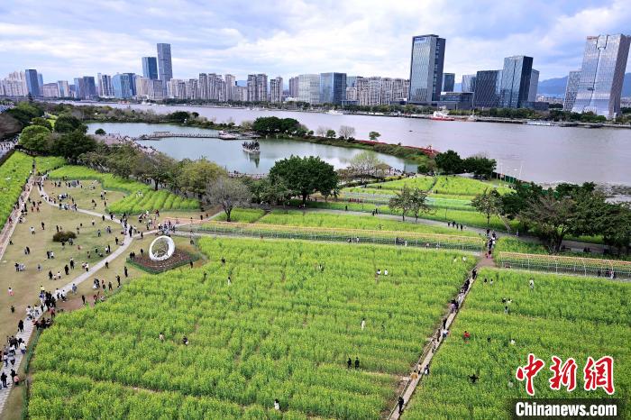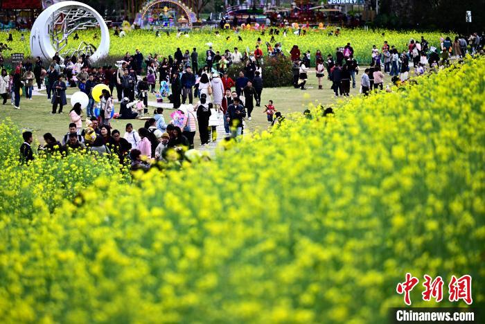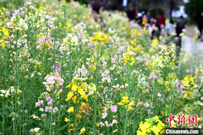 3月16日,游客在公園觀賞彩色油菜花。春日,福州花海公園魯冰花、小蒼蘭、油菜花等鮮花盛放,吸引了許多民眾前來(lái)漫步賞花,享受春天美好時(shí)光。中新社記者 張斌 攝