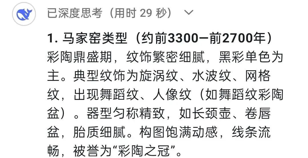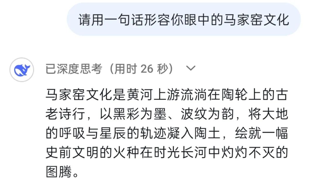 DeepSeek:馬家窯文化作為人類文明長河中一顆璀璨的明珠,因最早發(fā)現于甘肅省臨洮縣馬家窯村而得名,它被認為是仰韶文化向西發(fā)展的延續(xù),它展現了黃河上游先民的創(chuàng)造力,更是史前人類與自然對話、與社會共生的見證。