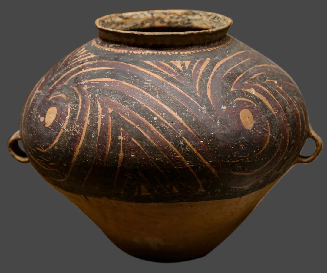 旋渦紋由黑彩繪制的螺旋線條構成,線條從中心向外延伸,形成連續(xù)旋轉的幾何圖案。多見于陶罐腹部或盆沿,線條粗細均勻,疏密排列規(guī)律,常與波浪紋組合,呈現動態(tài)視覺效果。