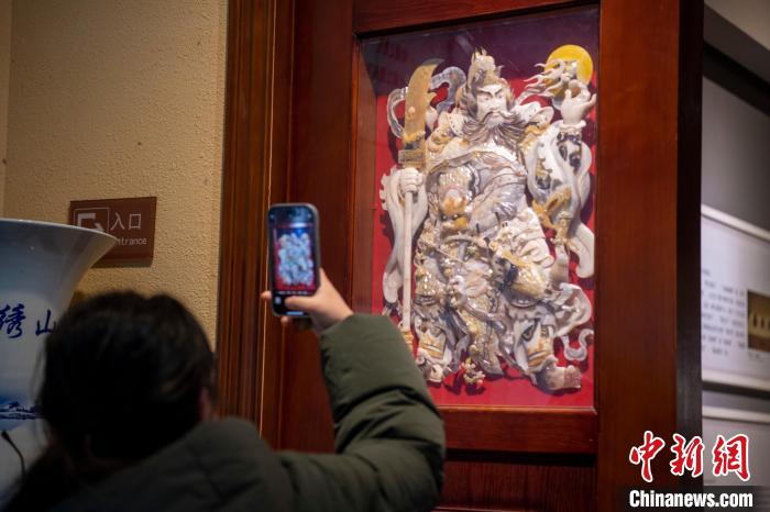2月3日,游客在廣西北海貝雕博物館拍攝貝雕作品《日月門神》?!£惽锵?nbsp;攝