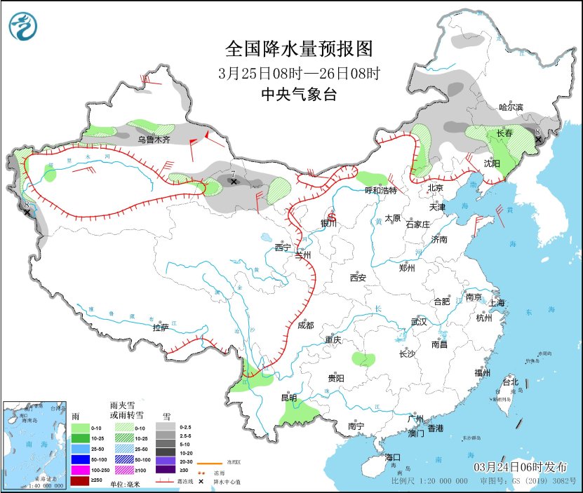 3月24日08時至25日08時,新疆北部和沿天山地區(qū)、內(nèi)蒙古東部、黑龍江西北部、吉林西北部和東部、河北北部等地部分地區(qū)有小到中雪或雨夾雪,其中,新疆阿勒泰和沿天山高海拔地區(qū)、內(nèi)蒙古東部等地部分地區(qū)有大到暴雪(10~15毫米)。新疆沿天山地區(qū)和伊犁河谷、內(nèi)蒙古東南部和西北部、遼寧北部、華北北部、西南地區(qū)南部和東部等地部分地區(qū)有小雨,其中,新疆伊犁河谷等地部分地區(qū)有中到大雨。內(nèi)蒙古中西部、山西北部、河北北部、黑龍江西部、山東半島、新疆北部等地部分地區(qū)有4~6級風(fēng)。內(nèi)蒙古西部、寧夏北部等地部分地區(qū)有揚(yáng)沙或浮塵,局地有沙塵暴。