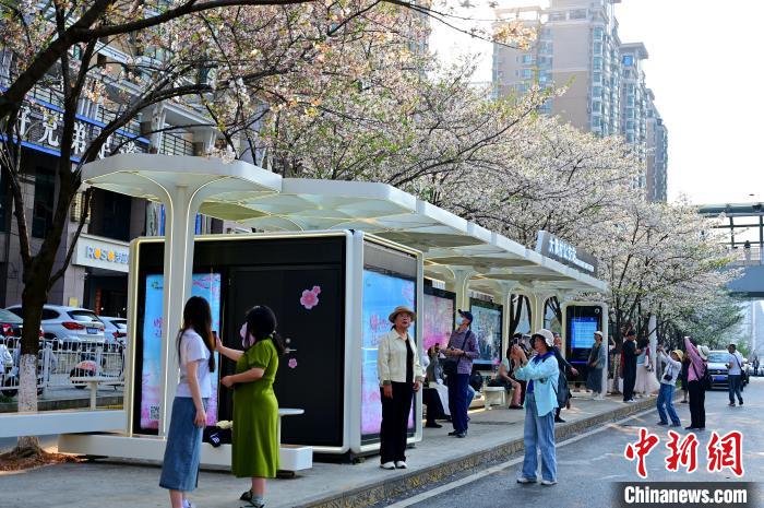圖為市民游客在珞喻東路大黃村公交站候車、拍照。劉康 攝