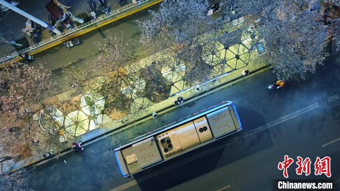 3月26日,被譽為武漢“最美櫻花車站”的珞喻東路大黃村公交站櫻花盛放。經(jīng)過改造的大黃村公交站,新增了自助售貨機、衛(wèi)生間、共享充電寶等便民設(shè)施,煥然一新的科技智慧站臺與粉白如霞的櫻花相映生輝。微風(fēng)吹過,櫻花花瓣浪漫飄零,吸引不少市民游客觀賞“打卡”。圖為公交車在珞喻東路大黃村公交站停留。(無人機照片)劉康 攝
