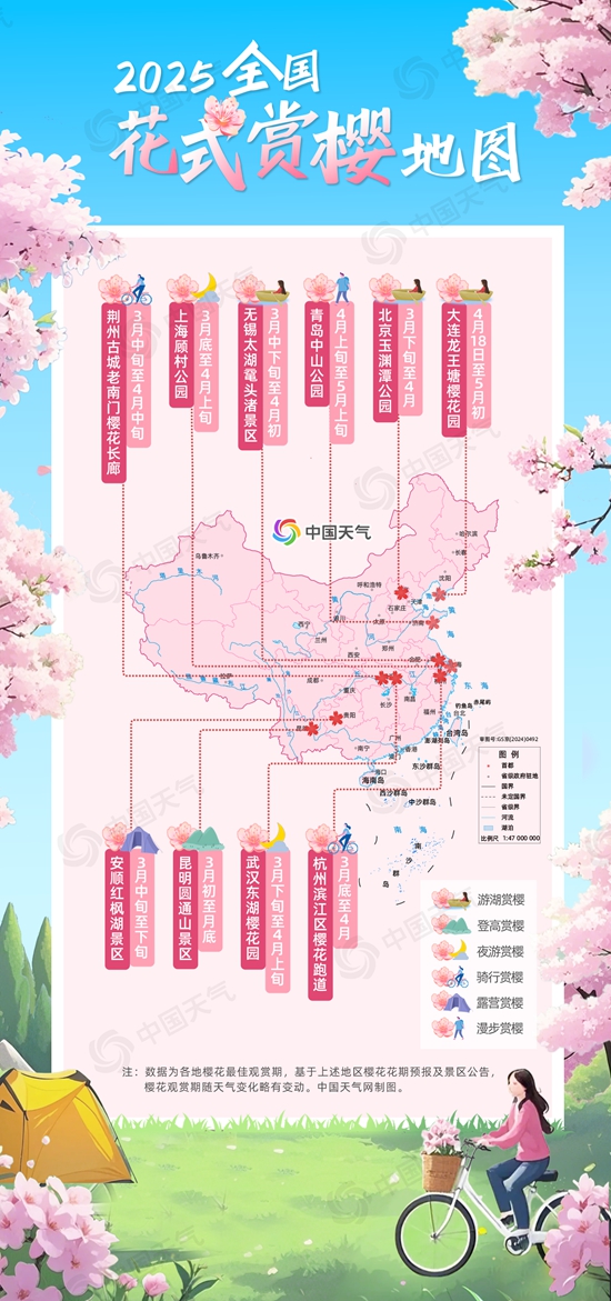從中國天氣網(wǎng)推出的2025全國花式賞櫻地圖來看,3月初櫻花花事已開啟,截至目前長江以南地區(qū)的櫻花已陸續(xù)迎來盛花期,北方3月底至4月初也將陸續(xù)進(jìn)入櫻花觀賞期。櫻花季如期而至,賞櫻方式愈發(fā)多元。傳統(tǒng)的游湖、登高、漫步賞櫻依舊備受青睞,夜游、騎行、露營等賞櫻方式也各具特色,成為人們賞櫻的新選擇。