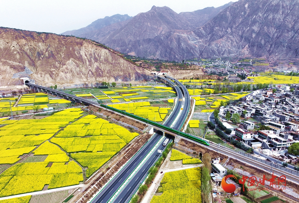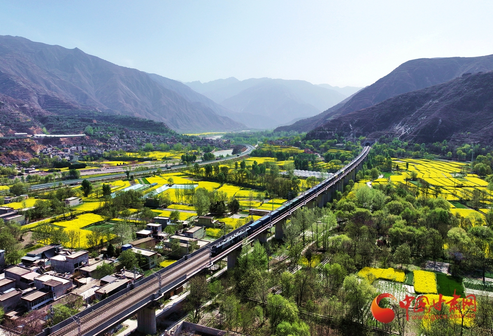 4月10日,列車在蘭渝鐵路宕昌縣沙灣鎮(zhèn)段附近行駛,穿行于花海之間?,F(xiàn)代交通動(dòng)脈與原始鄉(xiāng)野在此默契共生,火車轟隆駛過(guò),為春日畫卷增添了別樣的景致。
