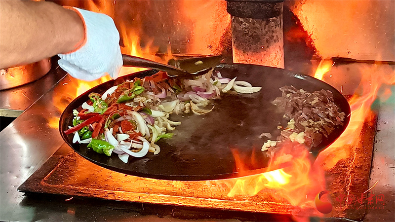 如今,炒撥拉已經(jīng)成為山丹人日常生活中不可或缺的一部分。在焉支巷子,游客可以看到多家炒撥拉店,每家店都有其獨特的炒制技藝和風(fēng)味。店家將切好的羊肝、肺、肚、腸、心等佐以洋蔥、青椒下入一個鑄鐵鏊子里,再加上幾勺鹽和辣椒面,開始用猛火爆炒?;鹦撬臑R,一頓撥拉之后,待到七分熟左右再放入提前準(zhǔn)備好的白餅塊一起翻炒即可。不一會兒,一鍋美味可口、熱熱乎乎的炒撥拉就制作完成了。