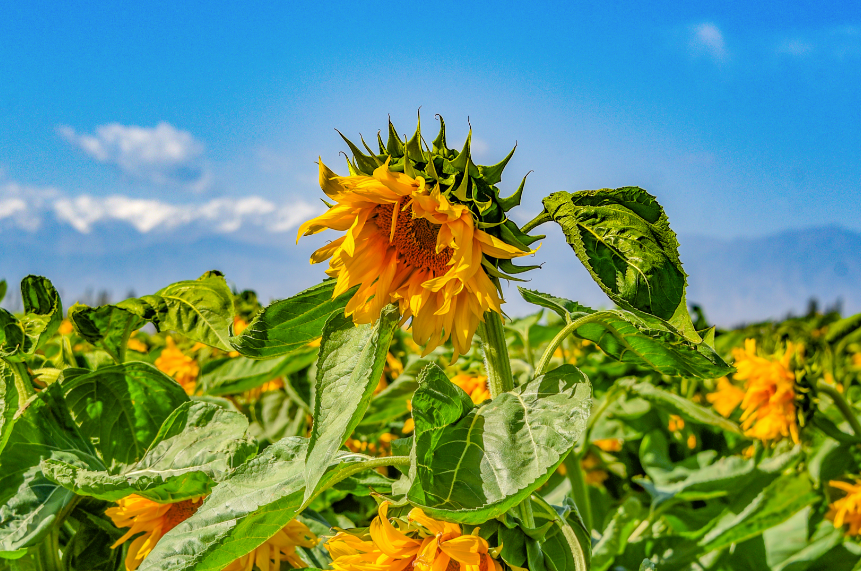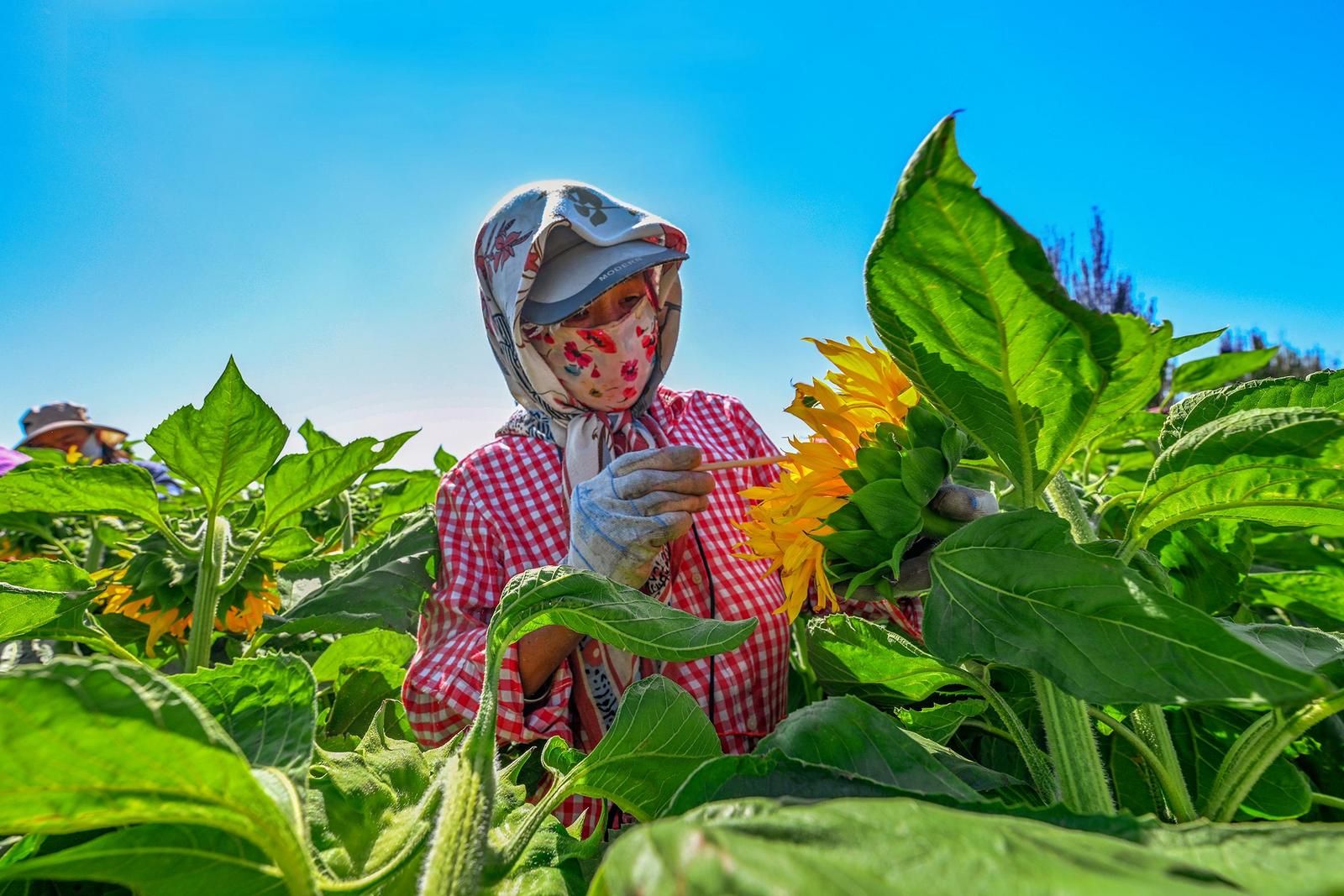 中國甘肅網(wǎng)7月14日訊 據(jù)嘉峪關(guān)日?qǐng)?bào)報(bào)道(融媒體中心記者 李巍 攝)近日,嘉峪關(guān)市新城鎮(zhèn)野麻灣村“千畝”制種向日葵迎來盛花期,朵朵花盤匯聚成金色花海,放眼望去,與雪山相融、與藍(lán)天相接,如詩如畫,美不勝收。