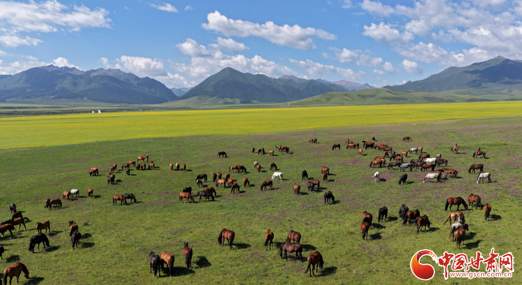 8月12日,在張掖山丹馬場,一場駿馬奔騰的壯闊景象震撼上演。藍(lán)天如洗,白云似絮,遠(yuǎn)處連綿的山巒勾勒出雄渾的天際線,腳下黃綠交織的草原如巨幅織錦般鋪展。成群棕白相間的駿馬,似靈動音符躍動于綠野,騎手身姿矯健,與奔騰的馬群、遼闊的天地渾然一體,盡顯草原的壯美景象。