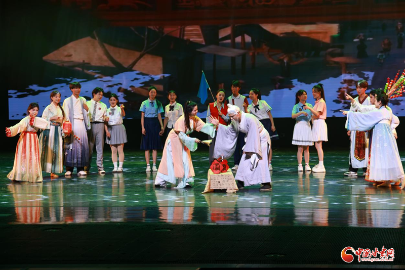 詩會以涼州詞為核心意象,主體分為“涼州·思”“涼州·行”“涼州·吟”“涼州·樂”四個篇章,各有側(cè)重又層層遞進,全方位展現(xiàn)涼州文化的多元魅力。第一篇章“涼州·思”以《天馬歌》的朗誦、《邊塞詩情》的情景劇與《鼓韻風(fēng)華》的表演,共同勾勒天馬傳奇與戍邊情懷,展現(xiàn)涼州深沉雄健的文化基因;第二篇章“涼州·行”借助AI主持與情景演繹,串聯(lián)起情景劇《跟著詩詞游武威》,以科技+文旅的視角,帶領(lǐng)觀眾開啟了一場沉浸式漫游;第三篇“涼州·吟”以《西涼樂舞》、音詩畫《涼州詞》等多元舞臺形式吟誦涼州詞章的雋永風(fēng)流,對誦表演《古涼新韻》,以“古今對話”解鎖涼州文化密碼,誦讀者交替誦讀“舊八景”與“新八景”組詩,從《大云晚鐘》《黃羊秋牧》等古景詩,到《河西都會》《摘星小鎮(zhèn)》等新景作,舞臺上“聲、形、畫、墨”交織,盡顯涼州古今風(fēng)貌,引得觀眾沉醉鼓掌;第四篇“涼州·樂”情景再現(xiàn)了《涼州夜宴》,品味葡萄美酒中的絲路情韻;尾聲“詩意涼州·藝游武威”,全場共同唱響對涼州的禮贊,并以“等你在涼州”發(fā)出誠摯邀約,讓千年涼州的詩意與魅力,在新時代持續(xù)綻放光彩。