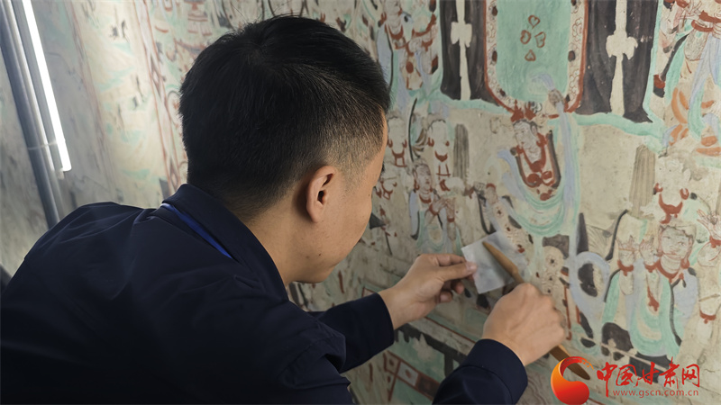 唐青松曾經(jīng)是一名莫高窟講解志愿者,在手電筒的柔和光源之下,他能更清楚看到壁畫里的病害,也更焦急如何更好保護壁畫,所以當(dāng)有機會成為壁畫修復(fù)師,他便拿起了保護工具,用五年時間傾心學(xué)習(xí),終于有了走進洞窟修復(fù)壁畫的機會。