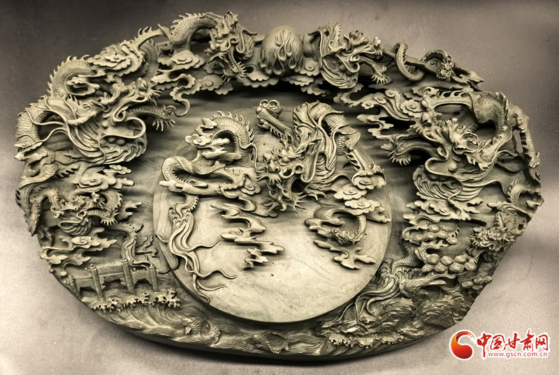 學成歸來后,徐哲將南北方工藝精髓融入洮硯創(chuàng)作:雕刻手法從鏤空、半鏤空轉向浮雕,讓洮硯既有精細雕工又方便存放;題材上,除傳統(tǒng)龍鳳外,加入敦煌飛天、黃河風情等地域文化元素,賦予洮硯更多文化內涵。